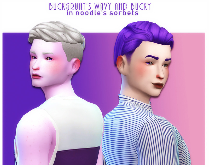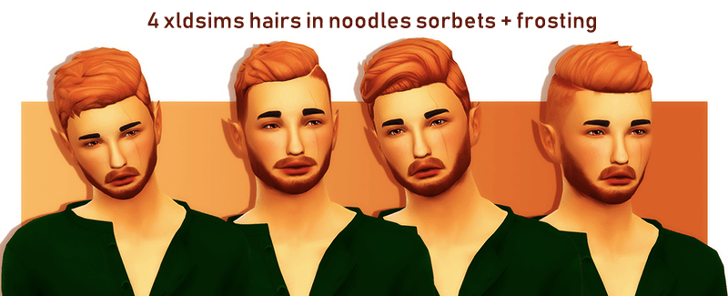 I have been meaning to do a lot of these for a while? So here. Have a mini hair dump! This is 4 of the fab xldsim’s male hairs in all 65 noodle sorbets swatches + holosprite’s frosting swatch for “pure white”. These are add-on swatches.